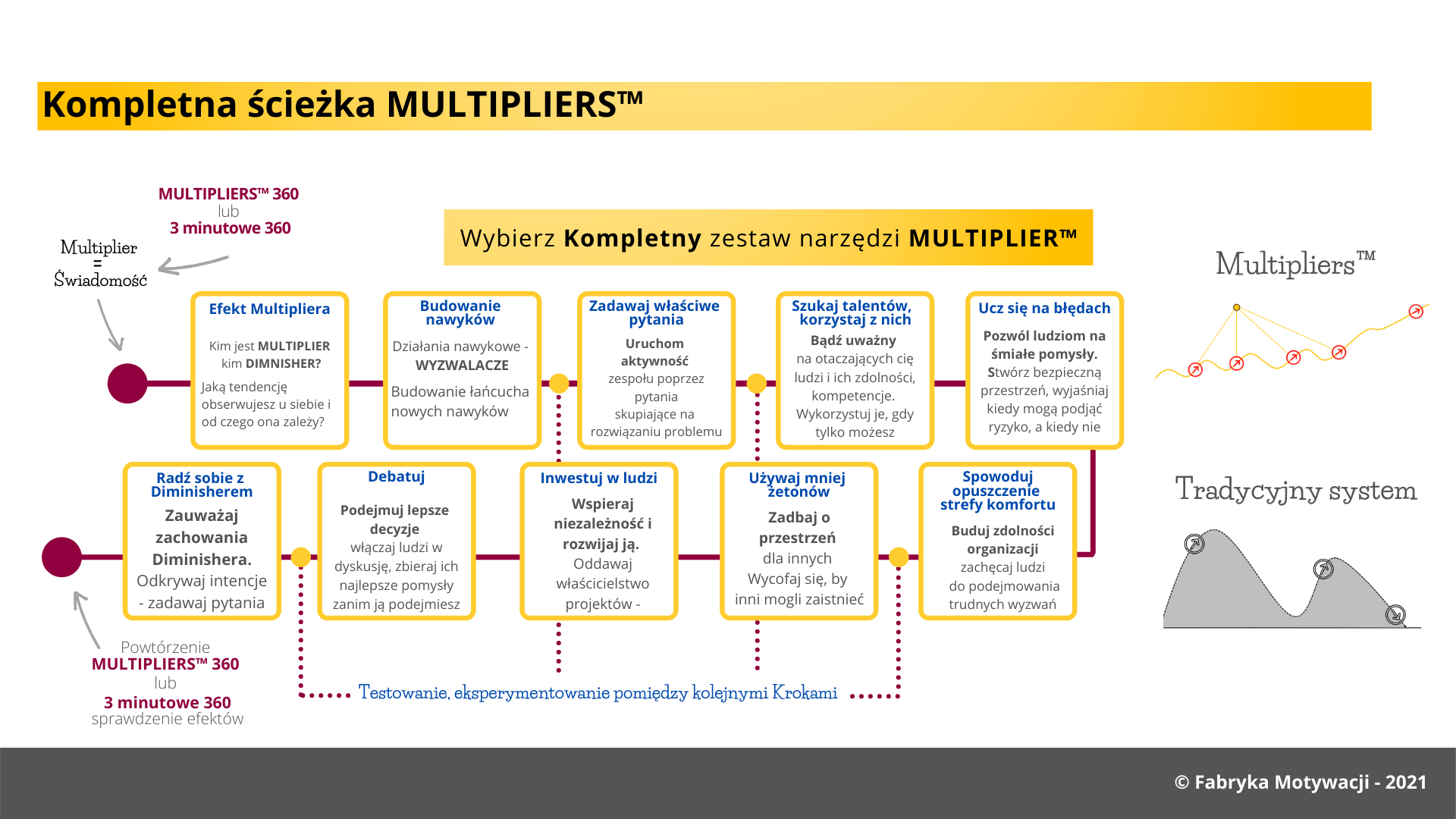 Odpowiednio przygotowany trener i coach Fabryki Motywacji zapewni indywidualną możliwość rozwoju menedżerom i małym zespołom. W połączeniu z oceną MULTIPLIERS 360, coaching zabiera liderów w osobistą odkrywczą podróż, której efektem jest nowe podejście do przywództwa. Uruchomienie i wykorzystanie potencjału drzemiącego w pracownikach prowadzi do transformacji menedżerskiej i organizacyjnej, uczy pracy w sytuacji niedoboru zasobów.